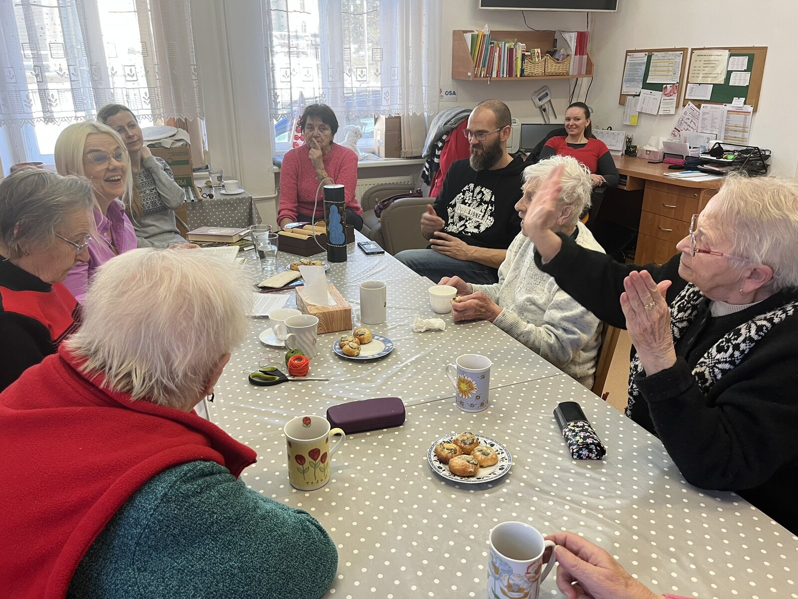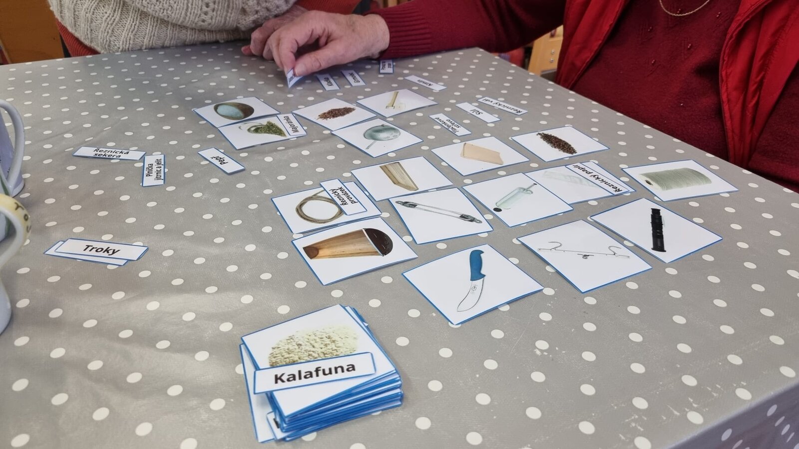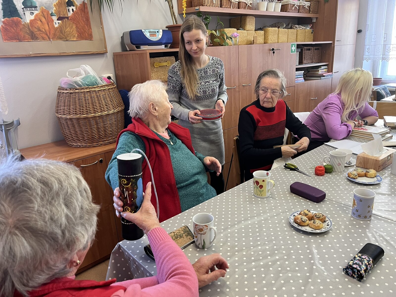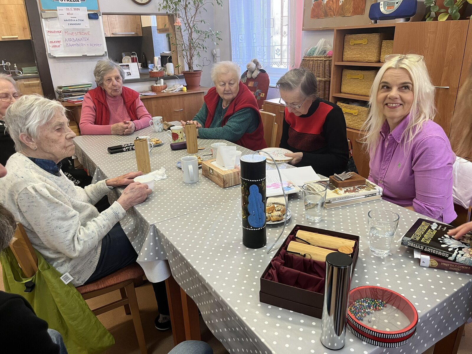 Milým zpestřením lednového programu byla návštěva našich milých známých – a to knihovnic ze Vsetínské Masarykovy knihovny, paní Irmy a Ivetky. Připravily si pro nás čtení povídek, pohádek a pověstí z Valašska, které nás přenesly do časů dávno minulých. Čtení prokládaly vědomostním kvízem valašských slov a hraním na netradiční hudební nástroje, které jsme si mohli sami vyzkoušet. Celé setkání bylo velmi přátelské, radostné a plné smíchu.