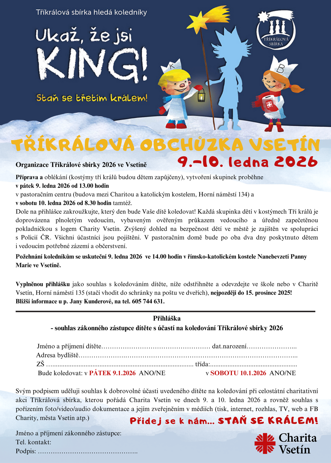 Všechny verze přihlášek k tříkrálové obchůzce, ať už tištěné nebo online, je nutno odevzdat nejpozději do 15. prosince 2025!