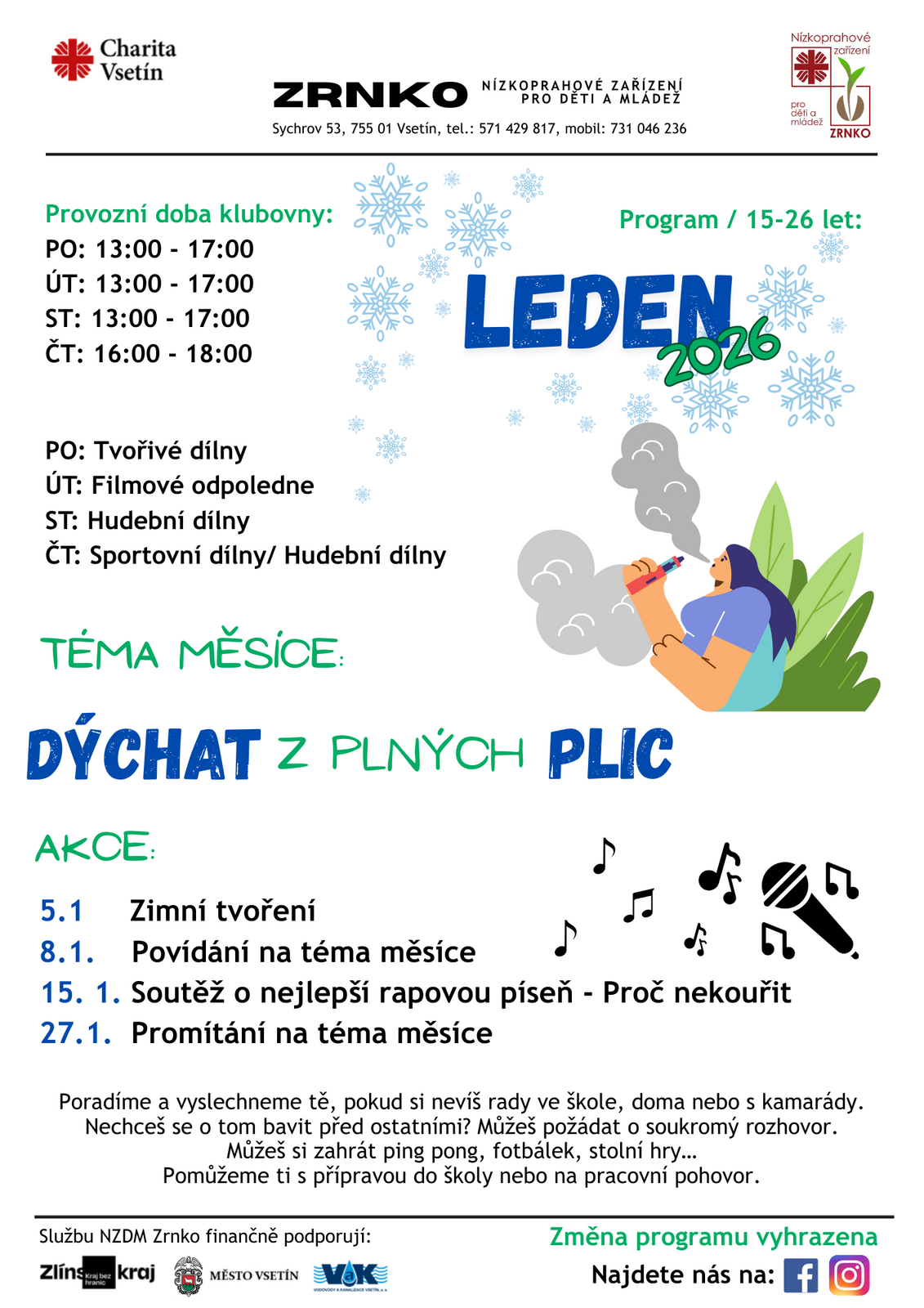 Nízkoprahové zařízení pro děti a mládež (NZDM) ZRNKO Charity Vsetín vytváří pro děti a mládež ve věku 6 – 26 let podmínky pro: trávení volného času (ping pong, dílna fotbalu, dílna boxu, tvoření, zajímavá témata k povídání), bezpečné a podnětné prostředí (poznáš nové kamarády, zahraješ si spoustu her, nebo si můžeš jenom popovídat s pracovníky, rádi Tě vyslechneme, poradíme a pomůžeme), místo kde můžeš během otevírací doby kdykoliv přijít a odejít (máš právo zůstat v anonymitě, nejsi povinen poskytnout pracovníkům nízkoprahového zařízení své osobní údaje).